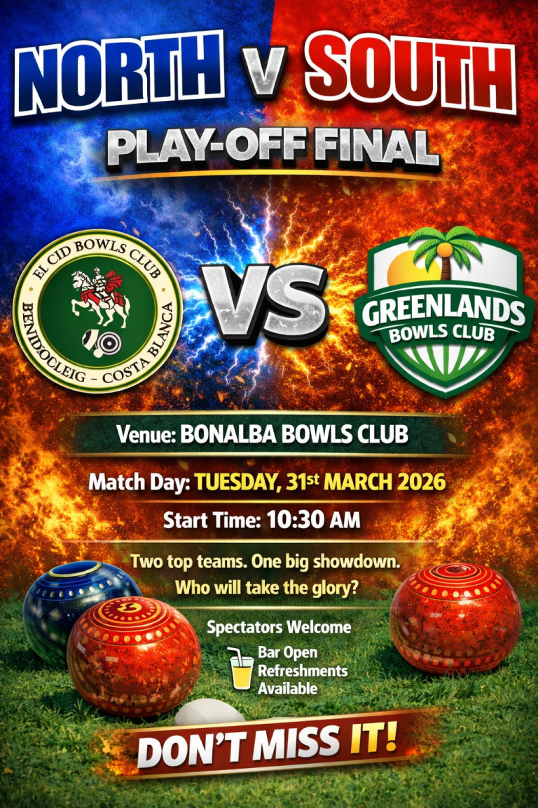 A fantastic morning of bowls at Bonalba for the North–South Playoff, with several tight and competitive games throughout. In the end, Greenlands came out on top, winning the match 3–1 against El Cid Bowls Club.